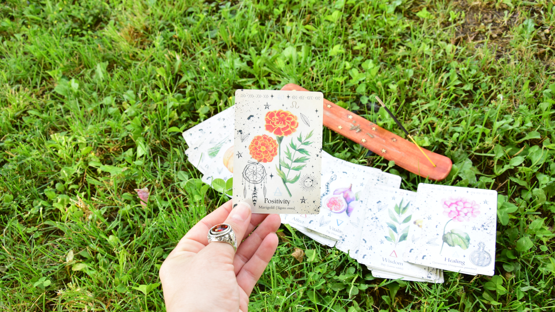 「オラクルカード」は20世紀後半に広まった比較的新しいカードで、悩みごとがあるときや、気分転換をしたいときなどに、カードに書かれた言葉や絵柄からインスピレーションを得ます。